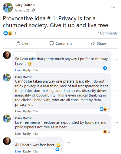 A question to consider is: are we able to measure how much is lost to self-censorship and conformity? If the loss is great and we are not able to mitigate that loss, that is a point upon which to reinstate strong data privacy.